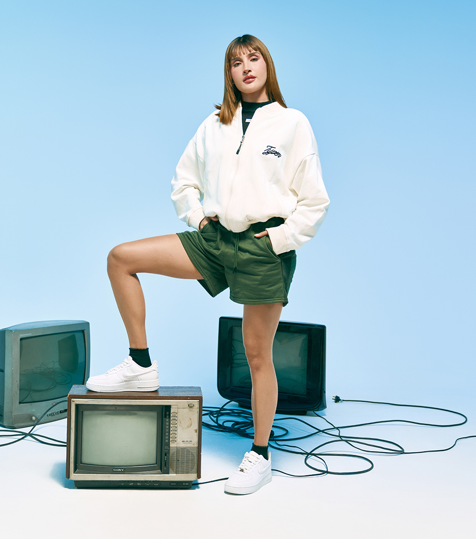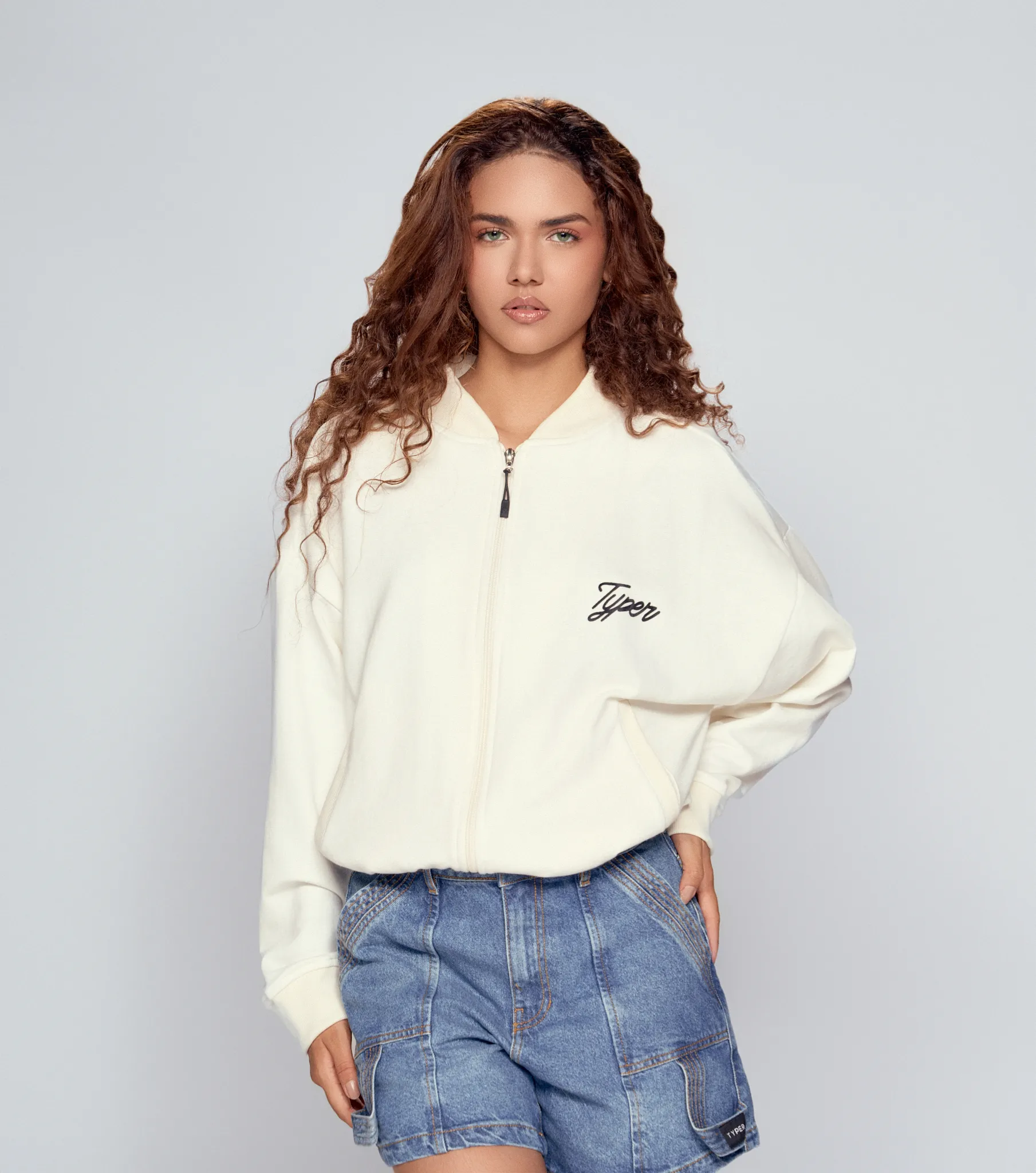 La chaqueta oversize tipo bomber en tono arena, con estampados Typer, se combina con el short relaxed verde oscuro en un match sport que respira comodidad y vibra urbana. Un outfit que se mueve entre lo suelto, lo gráfico y lo versátil.